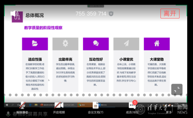 培养处副处长孙春柳、清华-伯克利深圳学院教学办刘健分别作深圳国际研究生院和清华-伯克利深圳学院在线教学阶段性总结报告。在线教学开展5周以来,学院高度重视教学工作,组织部署“三横三纵”全覆盖网络;授课教师课前准备充分,课堂互动多样;教务管理团队、信息化团队、学生工作系统、后勤保障系统、学生助教团队精诚合作,迎难而上。学院共开设课程122门,参与授课教师122位,选课学生3000余人,师生分布在18个国家和地区。累计学生出勤率99.96%,在线教学满意度大于93%,实现了“延期返校,正常教学,发挥优势,保质保量”。