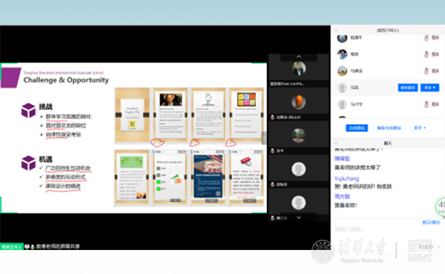 刘碧录分享了在线教学中的机遇与挑战。对于师生远程授课效果、国际学生时差、学生课堂参与感等问题,刘碧录积极与学生沟通,帮助学生调整心态;利用雨课堂、腾讯会议等多个平台优化教学方式;将实时提问调整为集中反馈、课后留言;加入上课铃声,以适应在线教学模式,增强课程仪式感。