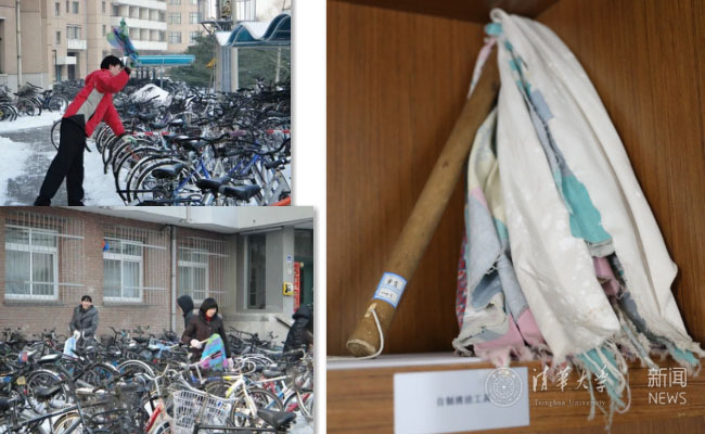 掸子是当年南区宿舍楼楼长清理同学车座上浮土和积雪的“神器”。那时,南区宿舍楼没有停车棚,同学们的车只能露天放置,容易积灰尘,雪天时上面会积上厚厚一层雪。楼长心疼同学们,便主动承担起帮大家清理的任务。楼长经过反复试验,最终用废弃的床单剪成12条三角形状的布条制作而成了特殊掸子。在清理过程中,他们还常常捡拾到同学落在车框中的贵重物品,帮助大家解决了不少麻烦。