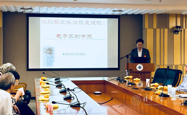 校友们对电子系的发展表示欣慰。随后,1974级校友和任教老教师进行了师生交流,共同追忆40年前的岁月。杜吉田代表1974级全体同学表达了对老师们的感恩和谢意。40年的风雨岁月,难忘恩师的谆谆教诲,老师们不仅教给了大家基本的知识和技术,更重要的是教导大家如何做一名优秀的清华学子。在场的老教师们也勉励同学们改变心态,要把握人生的每一段时光,保持愉快的心情。