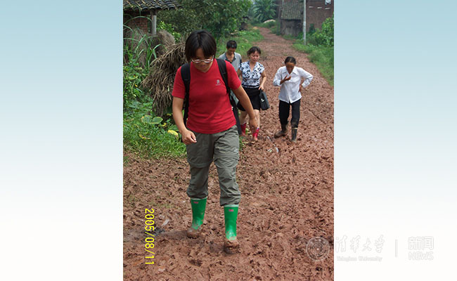 2005年学生处和院系老师前往四川大山深处的农业县看望家庭经济困难学生,老师们行进在下雨之后的泥浆地里奔赴学生家庭。