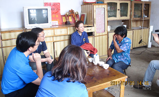 2011年,学生处教师与捐赠代表前往山东看望受助学生家庭,家长说到孩子作为体育特长生常年在外训练,流下了思念的泪水。