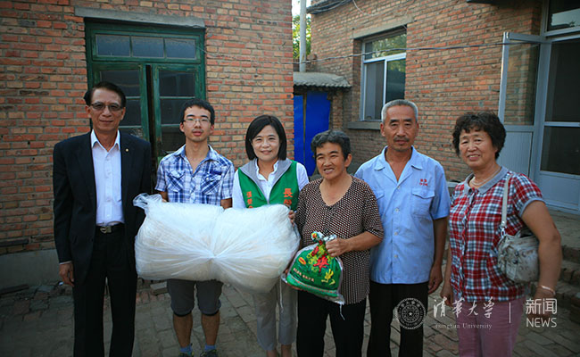 2014年,学生处、基金会教师带领来自台湾的5名捐赠企业代表前往河北看望受助学生家庭,走访同学是他们村60多年第一个考上清华的学生,父母为此感到非常的自豪,同时也对学校的资助表示感谢。