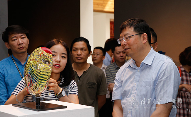 工艺美术系刘雨同学运用玻璃粘贴工艺,用玻璃粉料创作了中国传统食物《合》。邱勇在参观时高度赞扬了同学们的想象力、创造力和在艺术创作中体现出来的坚持不懈的精神。雕塑系柴鑫萌同学,将传统木制农具与纤维材料结合,在雕塑作品《田园温度》中创作了包子、犁车、辘轳等形象。为此,邱勇鼓励她继续在生活中发掘艺术创作的乐趣。
