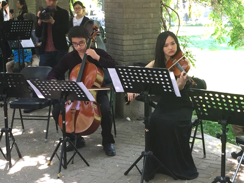 在紫藤肆意盛开的长廊里,观众们围绕着演奏者或坐或站。空间不大,情趣不少。“我是特地过来陶冶情操的。”一位观众说,“以前看过室内交响,没想到露天交响观众和表演者离得这么近。”十来个还没大提琴高的孩子就围坐在离乐器一米远左右的距离——他们多半是跟着父辈或祖辈的清华校友来为清华104岁生日庆生的。