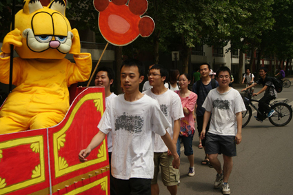 图为张帼玮(前一)与同学们在为物理系学生节做外场宣传。
