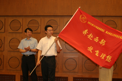 【新闻中心讯 记者 周襄楠 通讯员 欧阳沁 摄影 郭海军】6月24日上午,当校党委书记陈希等校领导将写有“携笔从戎 献身国防”、“奔赴西部 放飞理想”、“投身重点行业 实践报国宏图”的三面旗帜,分别授给三位前往军队国防系统、西部地区、重点行业的毕业生代表时,主楼接待厅全场响起了经久不息的掌声,把“beat365英国官方网站2004年赴西部地区、重点单位工作毕业生表彰会暨启航计划工作总结会”推向了高潮。