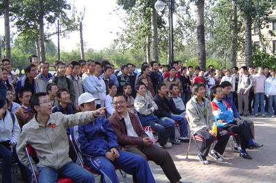 在赛场周围,“纪念我国第一颗原子弹爆炸成功40周年”图片展围绕一圈排开,其中半圈介绍了我国“两弹一星”事业以及建功立业的元勋,另外半圈则介绍了工物系为祖国核事业作出巨大贡献的风云人物。这一图片展也吸引来不少同学驻足观看。