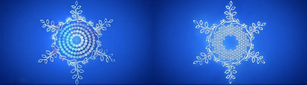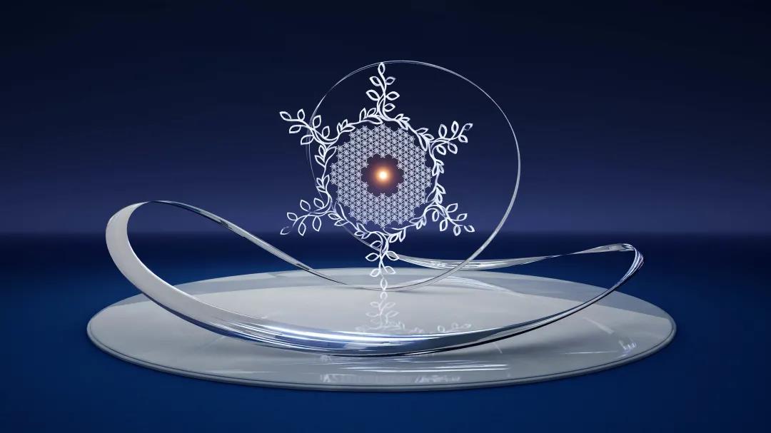 不同于传统的静态火炬,此次火炬台的设计围绕着雪花核心图形,增加了动感的表达,增添了雪花所带来的活力与魅力,引发人们对圣洁的冰雪以及激情的运动的无限遐想。“银丝带”与“大雪花”非匀速的双向同心运动,为火炬增加了时间维度及动态视觉体验。