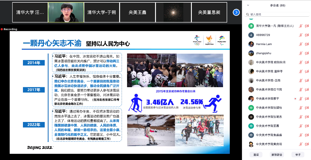 与会师生共同观看了纪录片《艺术里的奥林匹克:会徽(上)》,通过北京冬奥会和冬残奥会会徽专家评审委员会评委、中央美术学院院长范迪安的讲述,志愿者们感受到冬奥会徽“冬梦”中蕴藏的艺术之美、传统文化和奥林匹克精神的有机统一。