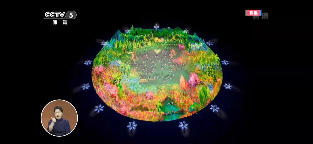 从 “冰雪蓝”到“五彩斑斓”,冬残奥圆舞曲极具感染力的色彩运用,更好地诠释了展现残疾人精神世界的设计初衷。高速的粒子扩散与聚拢的动态演绎,将圆舞曲的展演推向高潮,也进一步强化了影像的节奏感。视觉画面重新聚拢到圆心,幻化成雪花点火装置的视觉形象引导实体主火炬台的冉冉升起,再一次完成现场表演的虚实转换。