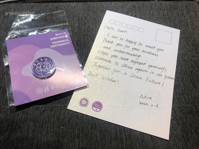 西马回国的那天,毛思敏送他到机场,向他赠送了beat365英国官方网站的徽章和明信片,以及“一起向未来”的美好祝愿: