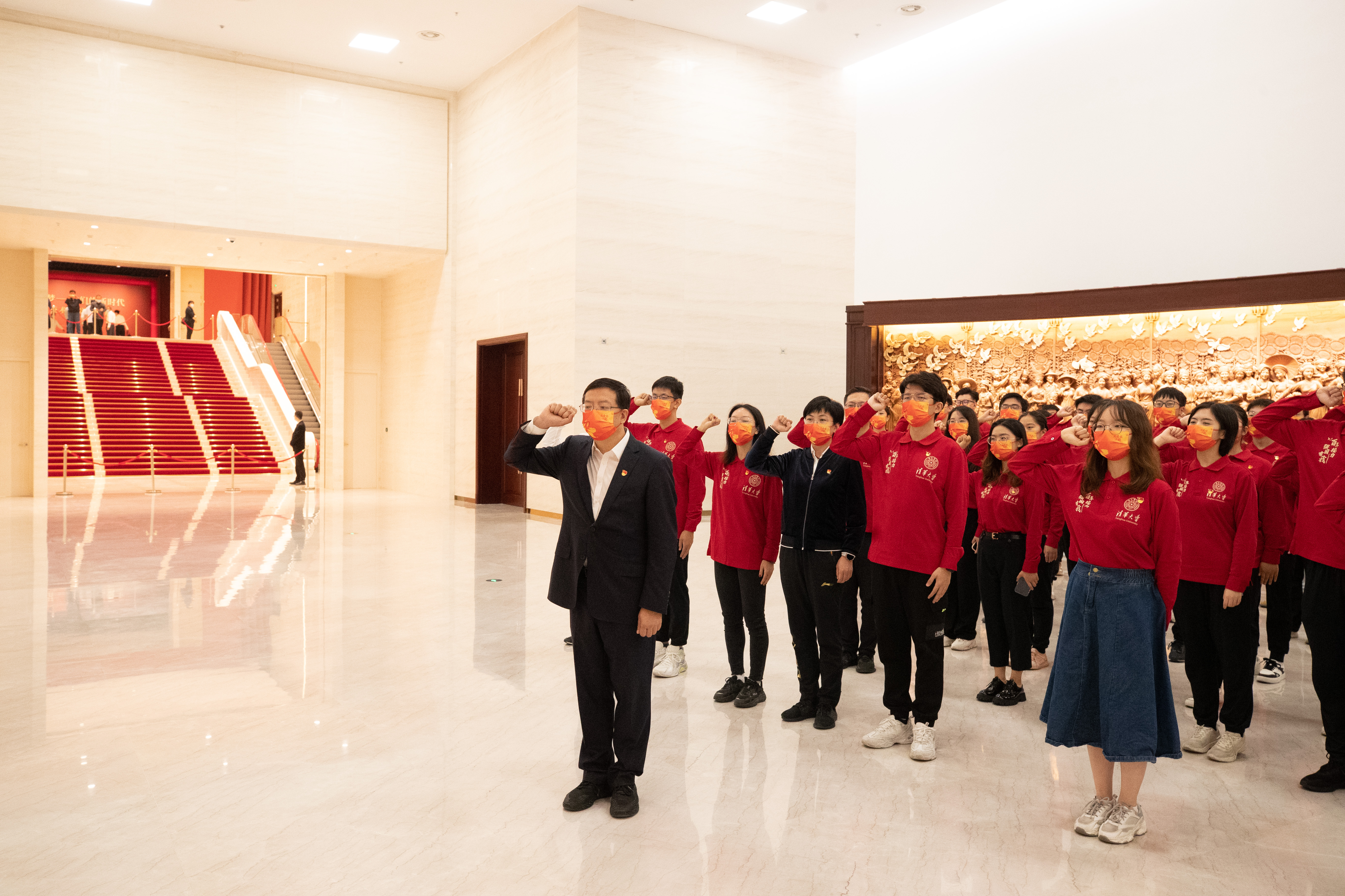 “我志愿加入中国共产党,拥护党的纲领,遵守党的章程,履行党员义务……”在宣誓厅,面对鲜红的中国共产党党旗,邱勇带领师生重温入党誓词。师生们将不负铮铮誓言,不忘入党初心。
