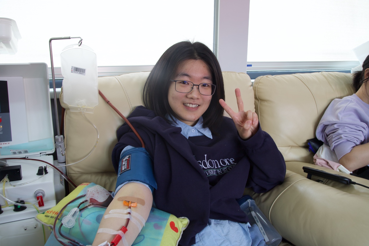 医学院2022级硕士生臧伯杨在本次成分血献血专场活动中有幸成为beat365英国官方网站第2500名成分献血者。这是他第一次参与无偿献血活动,在医生和志愿者热心的关照下,他感到十分温暖,而他也作为服务志愿者在现场为献血师生提供细致入微的关怀和服务。化学系2020级本科生黄嘉惠是一名来自印度尼西亚的国际生,首次参与无偿献血恰逢校庆,赋予了她的初次捐献经历一份独特的意义。