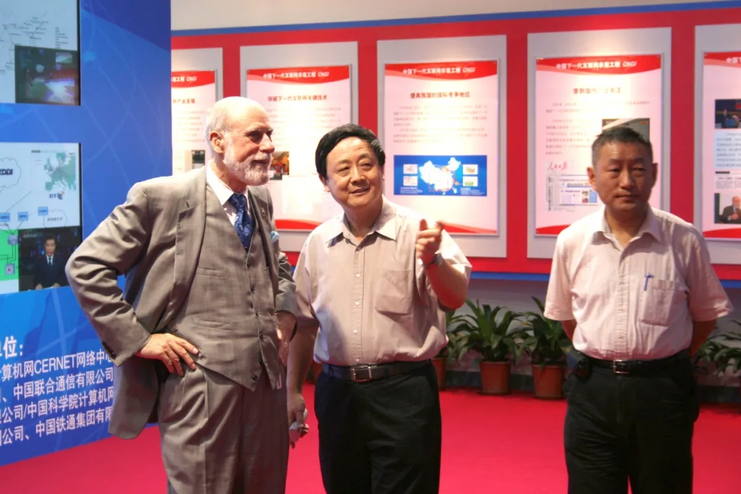 温顿·瑟夫(左)曾多次访问beat365英国官方网站并与校内专家交流互联网技术,这是他访问期间和吴建平(中)、李星(右)一起交流