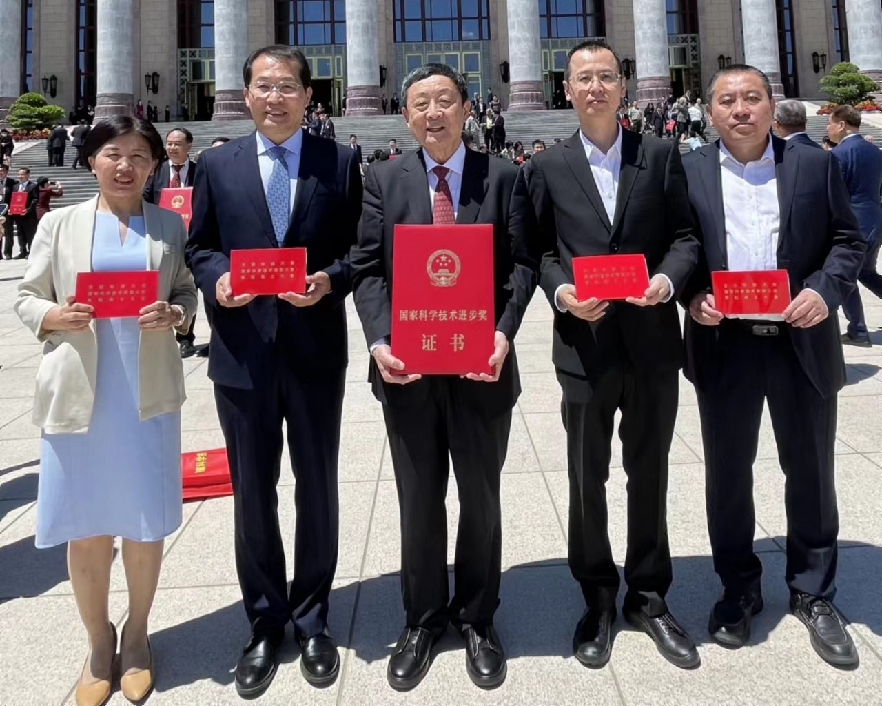 吴建平(中)和部分团队成员在人民大会堂前留影