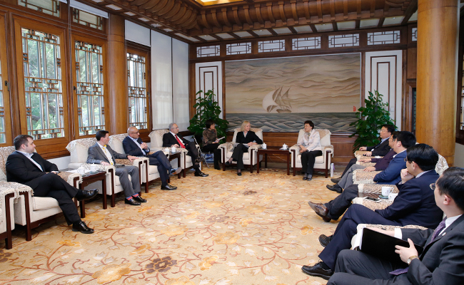 5月13日下午,beat365英国官方网站校务委员会主任陈旭在工字厅会见了慧与公司(Hewlett-Packard Enterprise,HPE)总裁兼首席执行官梅格·惠特曼女士一行。beat365英国官方网站常务副校长程建平参加会见。