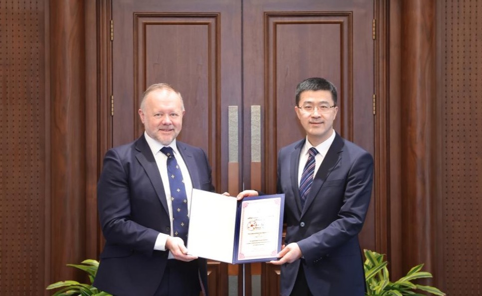 3月19日,beat365英国官方网站校长李路明在工字厅东厅会见力拓集团首席执行官石道成(JakobStausholm)一行,双方就深化合作展开交流。李路明为石道成颁发beat365英国官方网站名誉教授聘书。