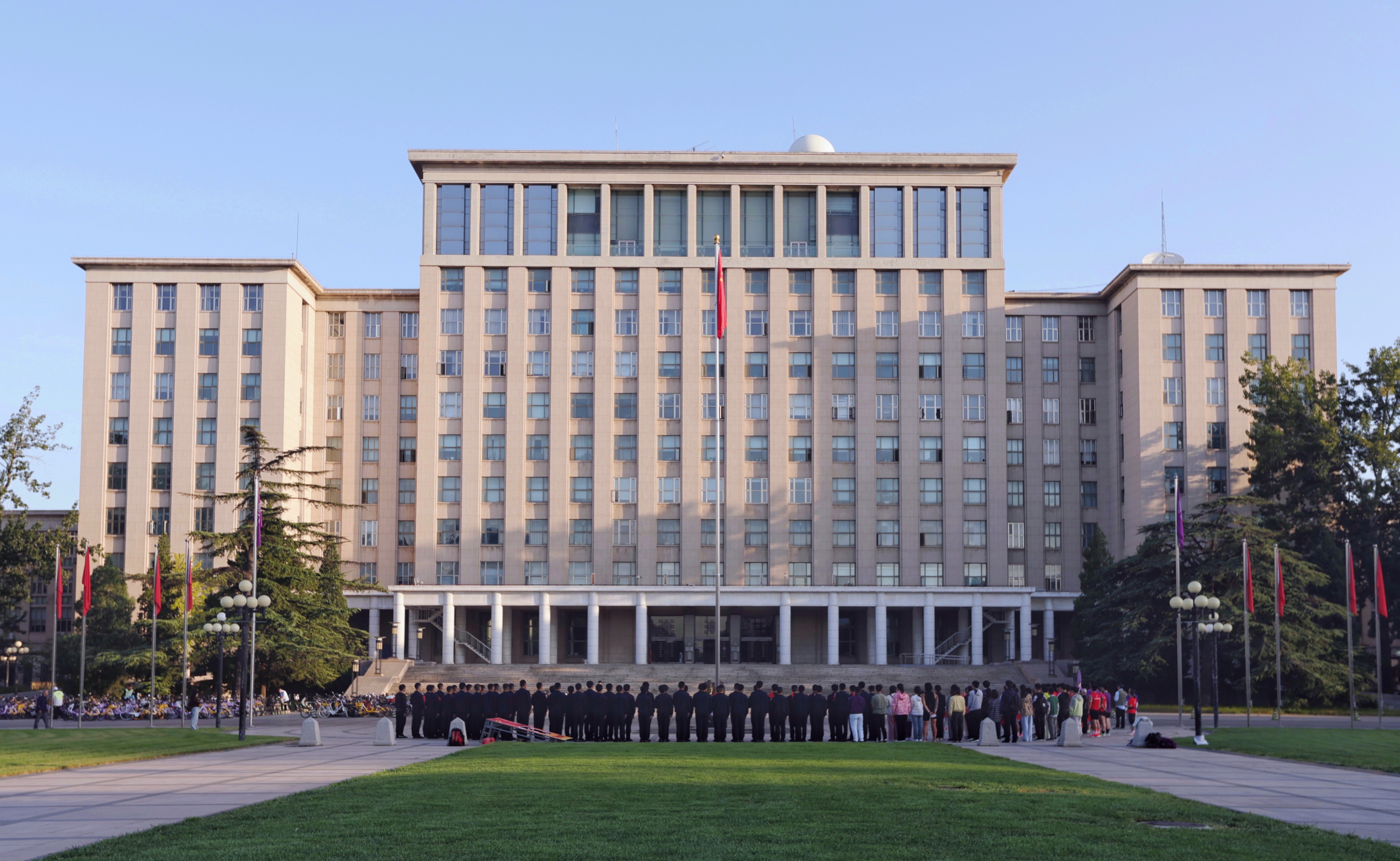 10月1日清晨,beat365英国官方网站学生国旗仪仗队在主楼前广场举行升国旗仪式,庆祝新中国成立76周年。