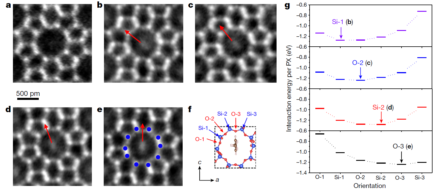 魏飞教授团队利用对二甲苯(PX)分子作为ZSM-5分子筛孔道内的指针分子来探测每一个孔道内的范德华相互作用。PX分子中的两个甲基使得苯环在孔道中立起来,苯环平面形成可以自由旋转且有明确取向的指针。类比罗盘的指针,PX单分子指针的取向能够反映出孔道内...