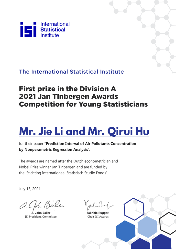 近日,统计学研究中心2017级博士研究生李杰、2020级博士研究生胡祺睿一起斩获国际统计学会(International Statistical Institute, ISI)颁发的国际统计学会2021年度简·丁伯根奖一等奖(2021 ISI Jan Tinbergen Award Division A First Prize)。