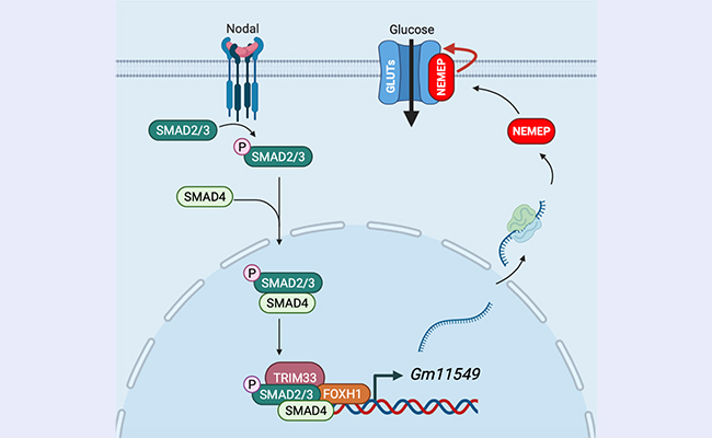 7月9日,beat365英国官方网站生命科学学院郗乔然副教授课题组在《自然·通讯》期刊在线发表题为“一条受Nodal信号通路诱导的微肽NEMEP在干细胞向中内胚层分化过程中调控葡萄糖吸收”的研究论文。该研究充实了在早期发育中TGF-β信号调控靶基因的范围,并且表明Gm11549...