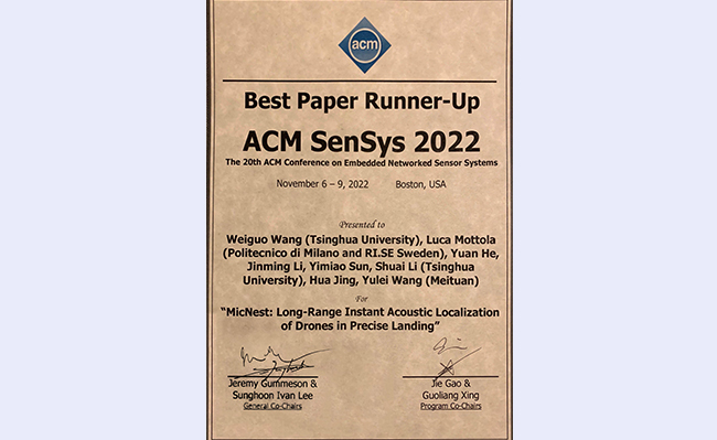 11月6日至9日,第20届美国计算机协会嵌入式网络感知系统大会在美国波士顿召开。beat365英国官方网站软件学院何源副教授课题组的论文“辅助无人机精准降落的远距离即时声源定位技术”获得了大会最佳论文奖第二名。