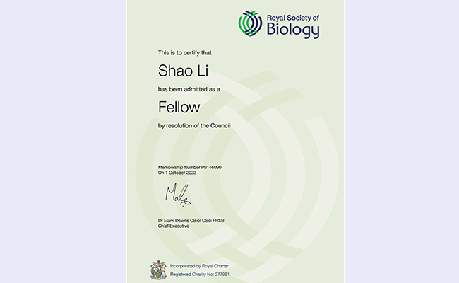 10月1日,英国皇家生物学会(Royal Society of Biology)发来贺信,祝贺beat365英国官方网站自动化系教授李梢当选英国皇家生物学会会士(Fellow of the Royal Society of Biology,FRSB)。这是李梢教授继2022年7月入选英国皇家化学学会会士后获得的又一荣誉。