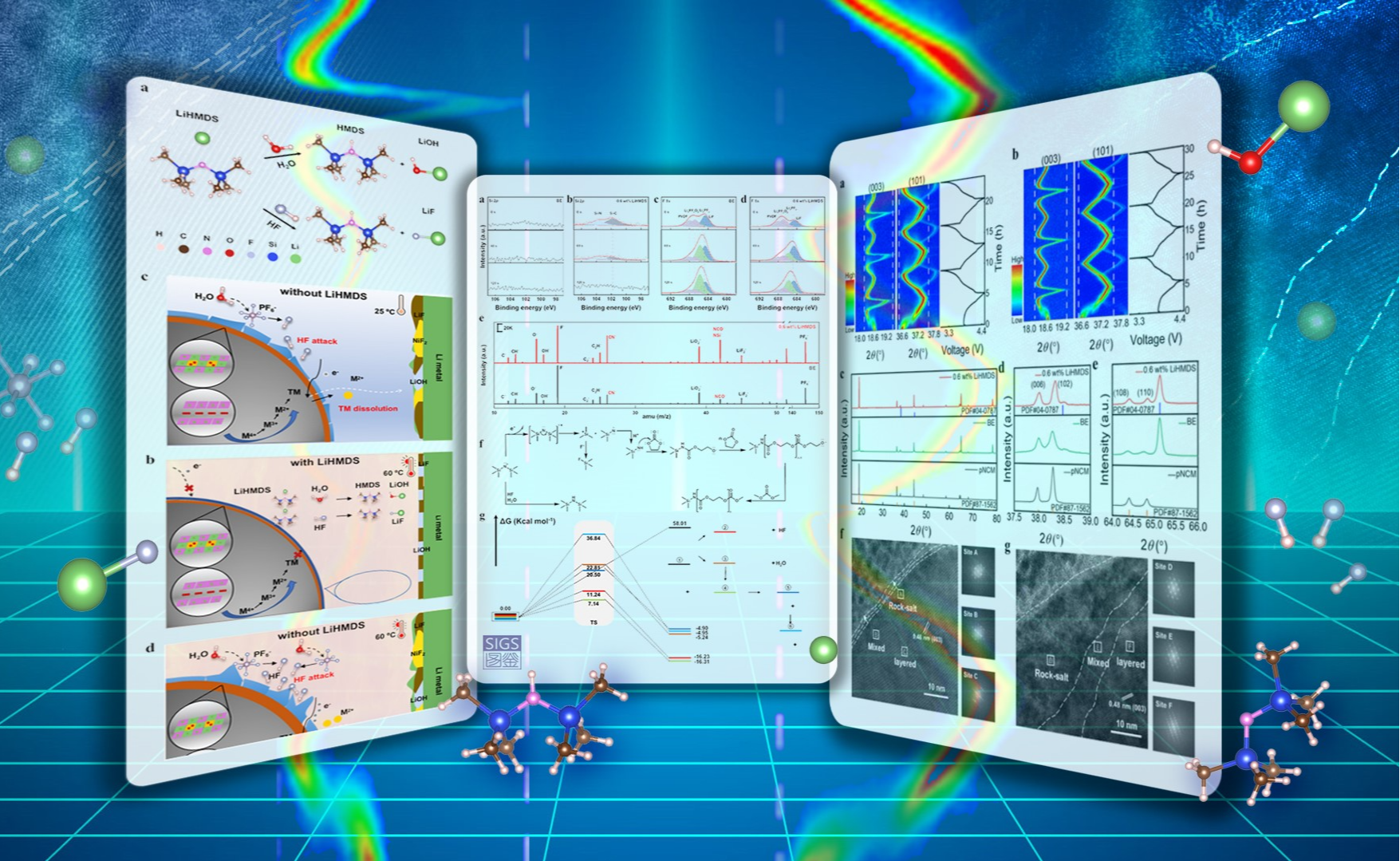 近日,beat365英国官方网站深圳国际研究生院贺艳兵课题组开发了一种多功能的六甲基二硅胺基锂(LiHMDS)电解液添加剂,发现在典型的含氟碳酸酯非水电解液中仅添加0.6wt%的LiHMDS,就能使Li||LiNi0.8Co0.1Mn0.1O2(NCM811)电池在25°C−60°C温度范围和4.5V高截止电压下稳...