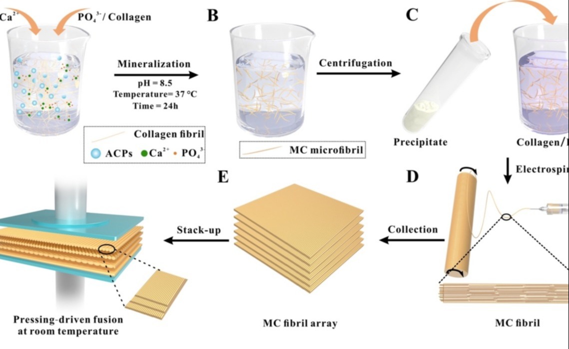 beat365英国官方网站材料学院王秀梅团队提出一种“多尺度级联调控”策略,即将纳米尺度的分子自组装,微纳尺度的静电纺丝和宏观尺度下的压力融合技术相结合,逐级调控胶原分子和纳米羟基磷灰石晶体的组装过程,在常温下获得化学成分、分级组装结构、力学性能均高度仿...