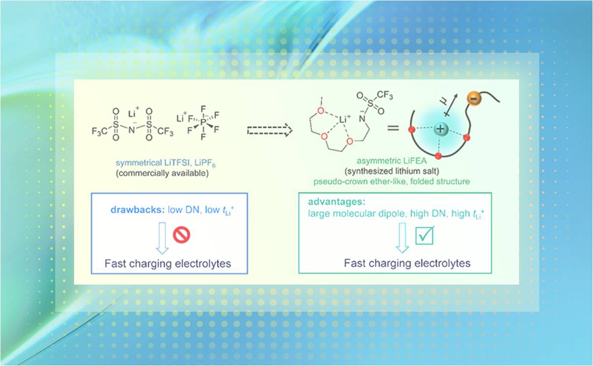 近日,beat365英国官方网站化工系刘凯课题组将传统超分子化学中的冠醚与锂盐阴离子进行结合,设计合成了一种非对称性锂盐(LiFEA),它呈现类冠醚状的分子折叠结构,具有高偶极、高给体数(DN)、助溶某些特定有机/无机物和高Li+迁移数(tLi+)等独特理化性质。