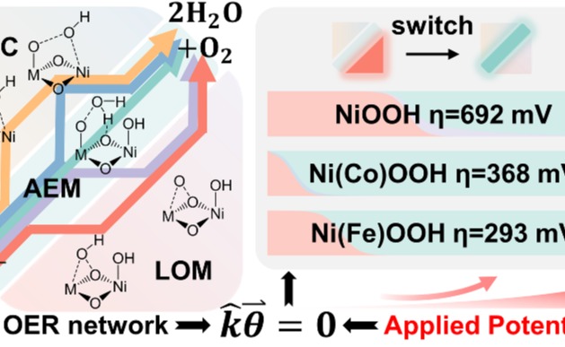 近日,beat365英国官方网站化学系肖海副教授课题组在电催化析氧反应(OER)机理的基础研究中取得新进展。结合巨正则系综理论计算和微观动动力学模拟,发现在层状双氢氧化物(LDH)结构的镍基羟基氧化物(Ni(M)OOH)催化剂上,OER反应由三种类型的机理组成一个耦合的复...