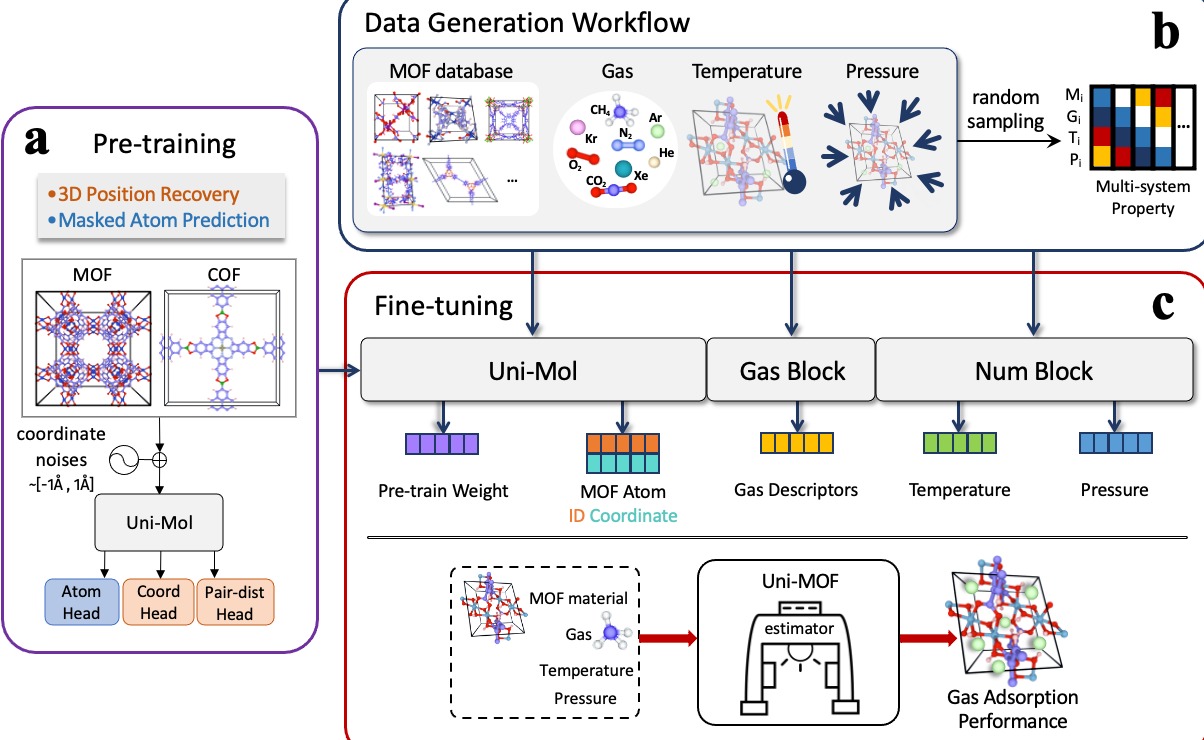 近日,beat365英国官方网站化工系卢滇楠教授团队联合美国加州大学河滨分校吴建中教授和北京科学智能研究院高志锋研究员研发出三维MOF材料吸附行为的机器学习模型Uni-MOF,用于预测各类工况下纳米多孔材料对各类气体的吸附性能。