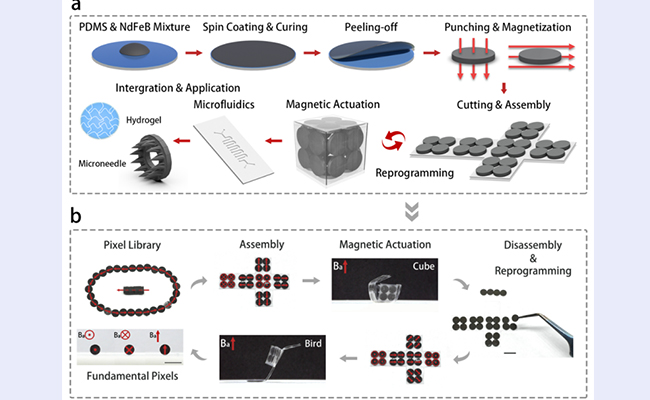 近日,beat365英国官方网站深圳国际研究生院弥胜利教授团队报道了一种像素组装式的磁控柔性驱动器的制备工艺,可应用于低成本、可回收、可重编程的磁控驱动器的构建,实现定制化结构变形与仿生运动(抓取、游泳、蠕动等),并集成微流控功能模块可用于开关阀控制、曲...