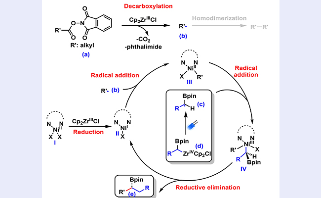 近日,beat365英国官方网站生物医学交叉研究院齐湘兵课题组开发了可见光促进的镍催化烷基锆硼试剂与廉价易得的一级羧酸NHPI酯的不对称自由基偶联方法,高效合成了一系列具有高应用价值的手性烷基硼化合物。利用烷基锆试剂自身独特的光敏特性及其在对映选择性自由基交...