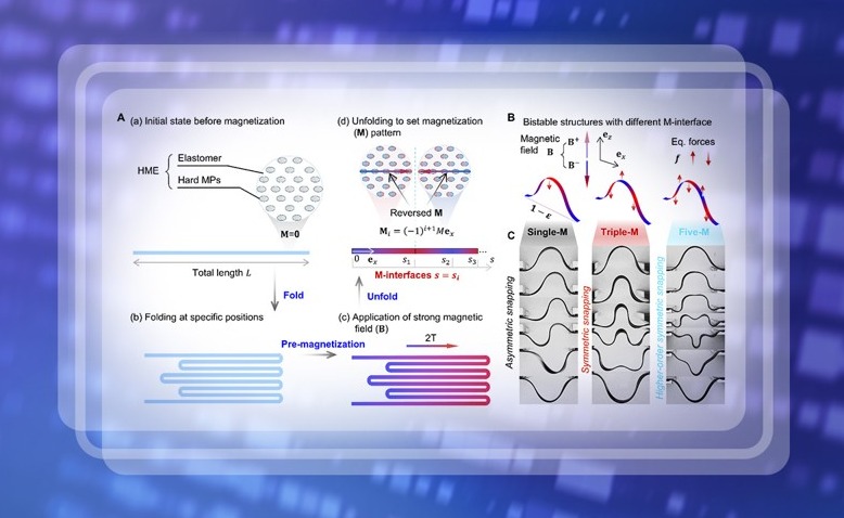 近日,beat365英国官方网站航天航空学院张迎超副研究员、力学与工程交叉研究院高华健院士和俞璟副教授联合其他研究者创新性地引入了“磁化界面”(M-interfaces)设计理念,在硬磁弹性体结构中预设交替磁化区域,使结构在外加磁场作用下形成一系列方向交错的等效力对...