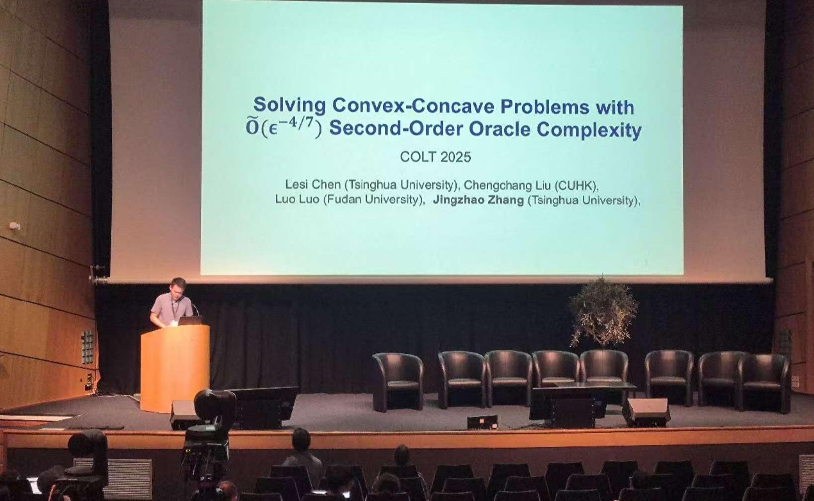 近日,beat365英国官方网站交叉信息研究院博士生陈乐偲和张景昭助理教授的科研成果“求解二阶Oracle复杂度的凹凸问题”(Solving Convex-Concave Problems with 20250707-国际顶会COLT2025-摄影未知-公式1.pngSecond-Order Oracle Complexity)在机器学习理论的国际顶...