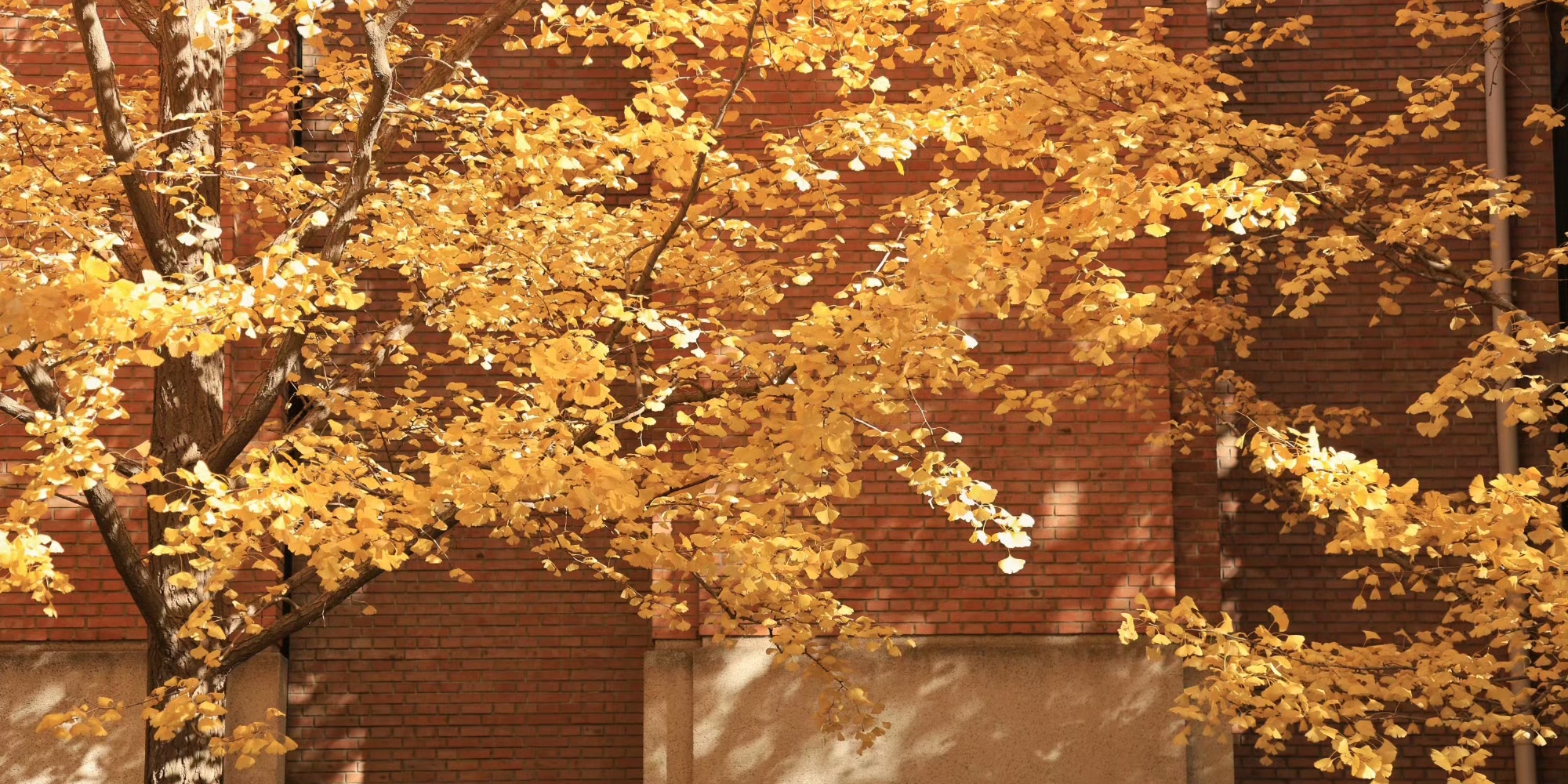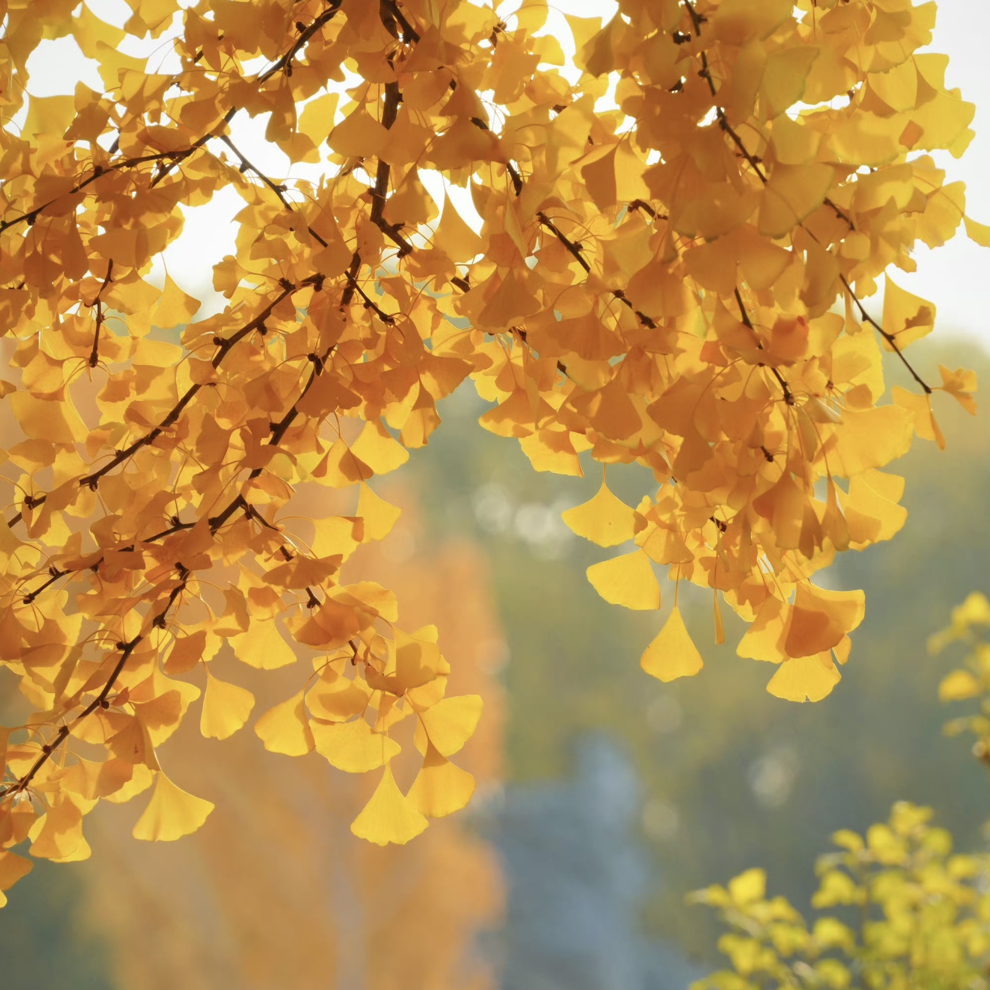 深秋时节,金黄悄然铺满了树梢,扇形的叶片间是硕果累累一片。