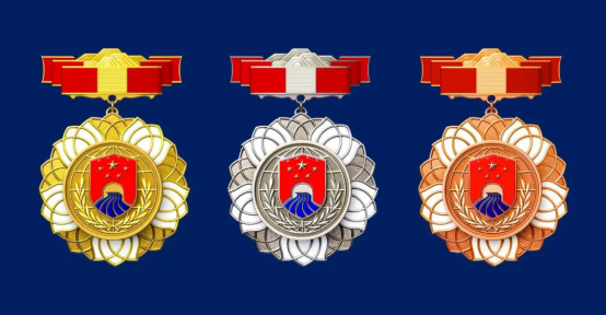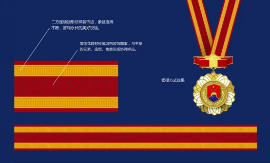 戍守边疆纪念章主章由五星、长城关隘、盾牌、橄榄枝、雪莲花等元素构成。体现移民管理机构依法履行职责,担负维护国家主权、安全和发展利益,促进服务经济社会发展,保障中外人员交往交流使命任务。雪莲花寓意坚守、无畏、纯洁,象征戍边民警的忠诚信念和崇高品格、顽强意志和无私奉献、斗争精神和血性担当。副章由飘带、山峰、如意等元素构成,金银铜色条分别代表戍边30年、20年、10年。