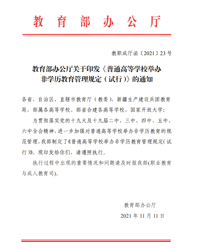教育部办公厅关于印发《普通高等学校举办非学历教育管理规定(试行)》的通知
